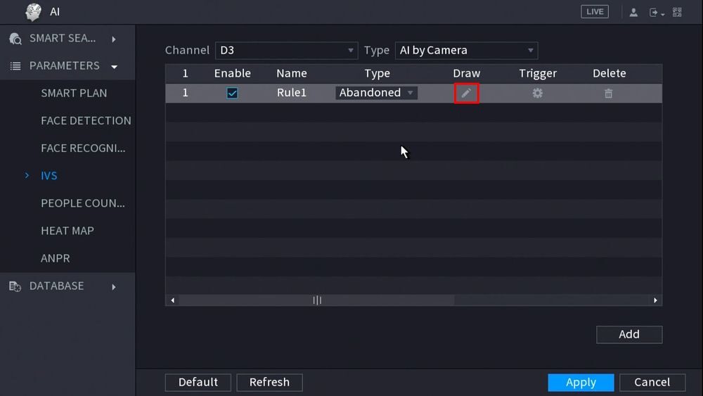 6. در سربرگ Rule Config بخش Rule Details بروی دکمه Add Rule کلیک کنید و در بخش Rule Type باید Abandoned Object را انتخاب کنید. محدوده تشخیص را رسم کنید.